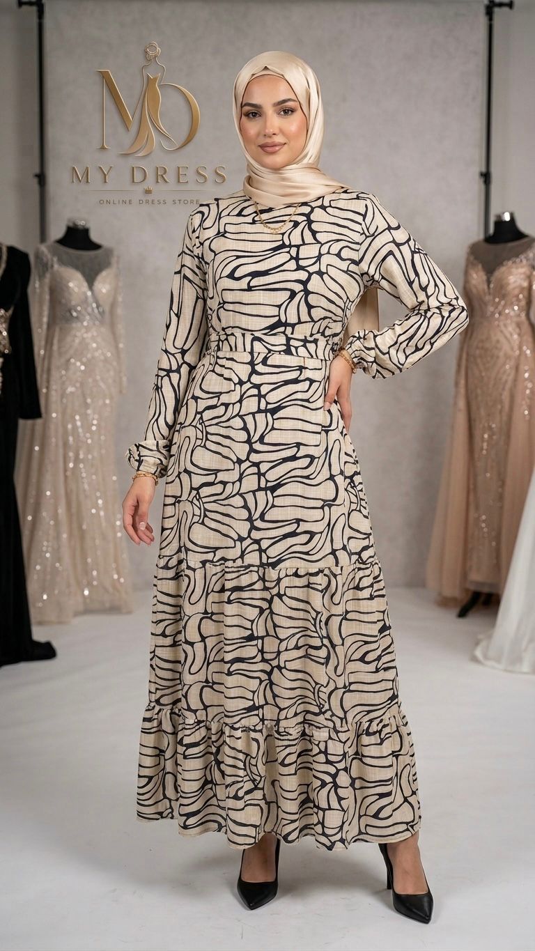 فستان محتشم بتصميم أنيق ونقشة ناعمة، بقصة مريحة وانسيابية مع خصر محدد وأكمام طويلة. مثالي لإطلالة يومية شيك أو مناسبة هادئة، بخامة خفيفة توفر راحة طوال اليوم.